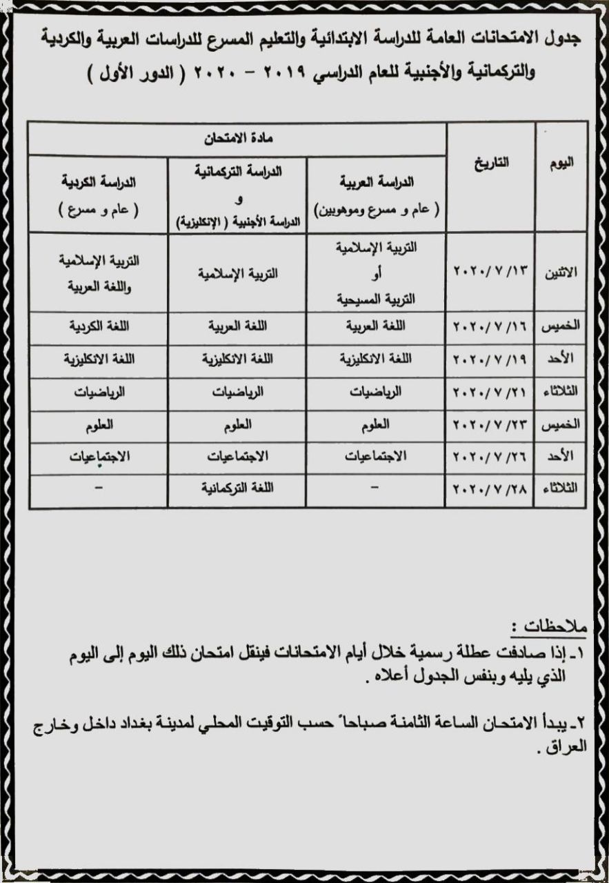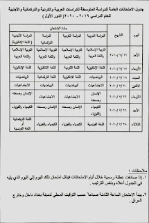 وزارة التربية العراقية جدول الامتحانات الوزارية 2020